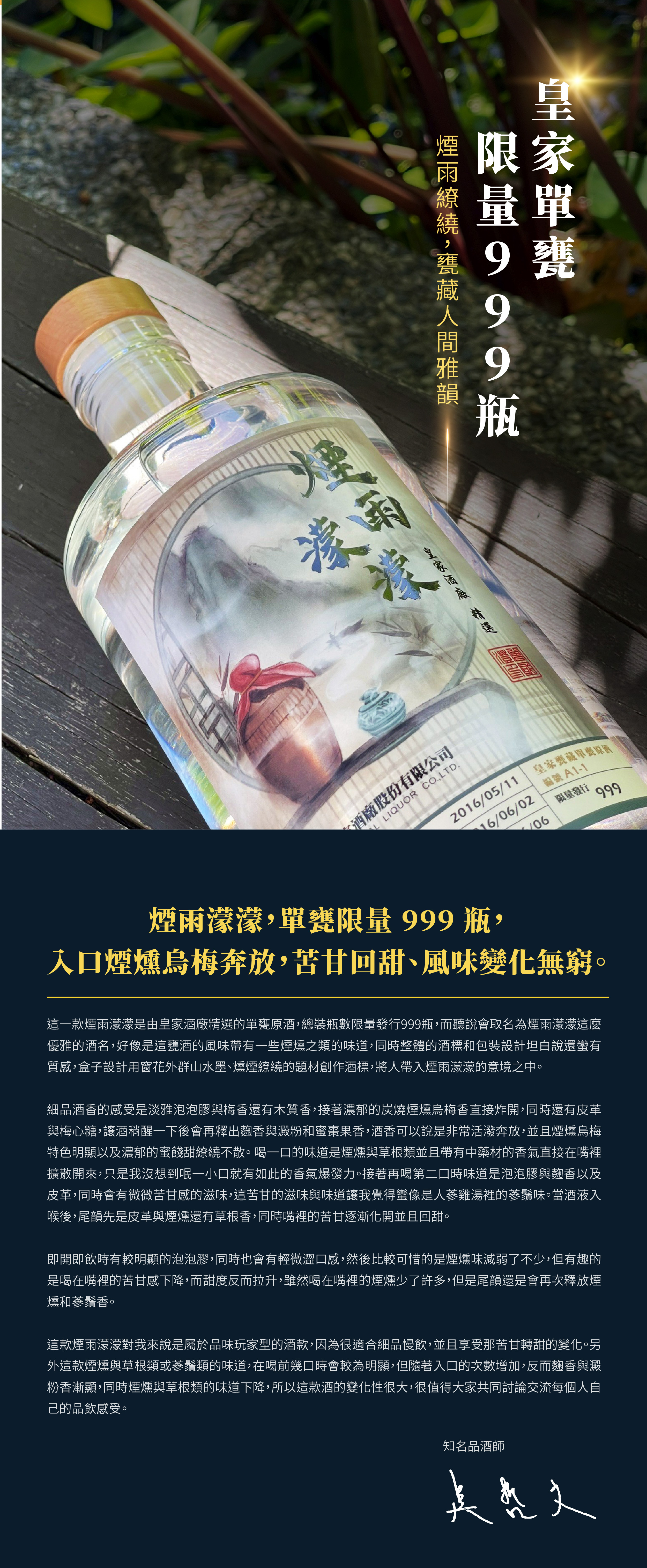 這一款煙雨濛濛是由皇家酒廠精選的單甕原酒,總裝瓶數限量發行 999 瓶,